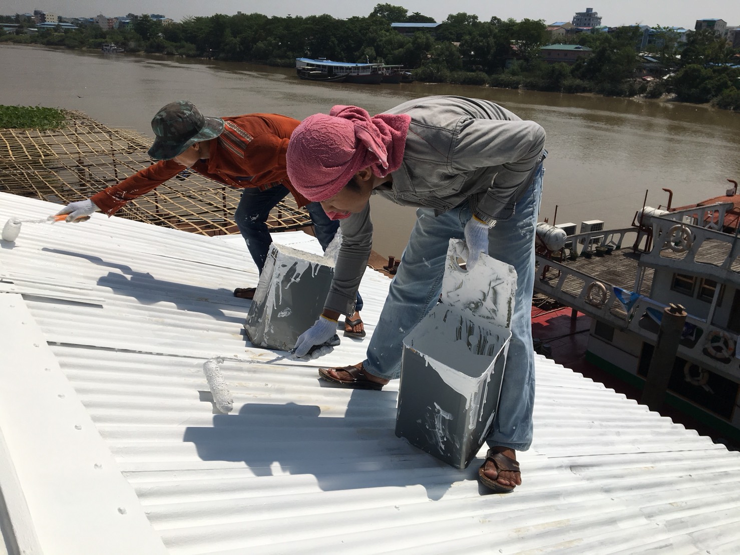今回、遮熱・断熱塗料ルミナスターを日本からミャンマーに持ち込み、この商品の良さを体感してもらい需要が増えればと思い屋根を施工してきました。